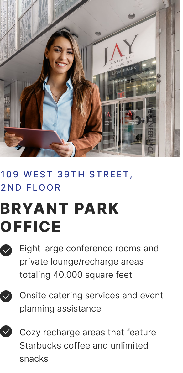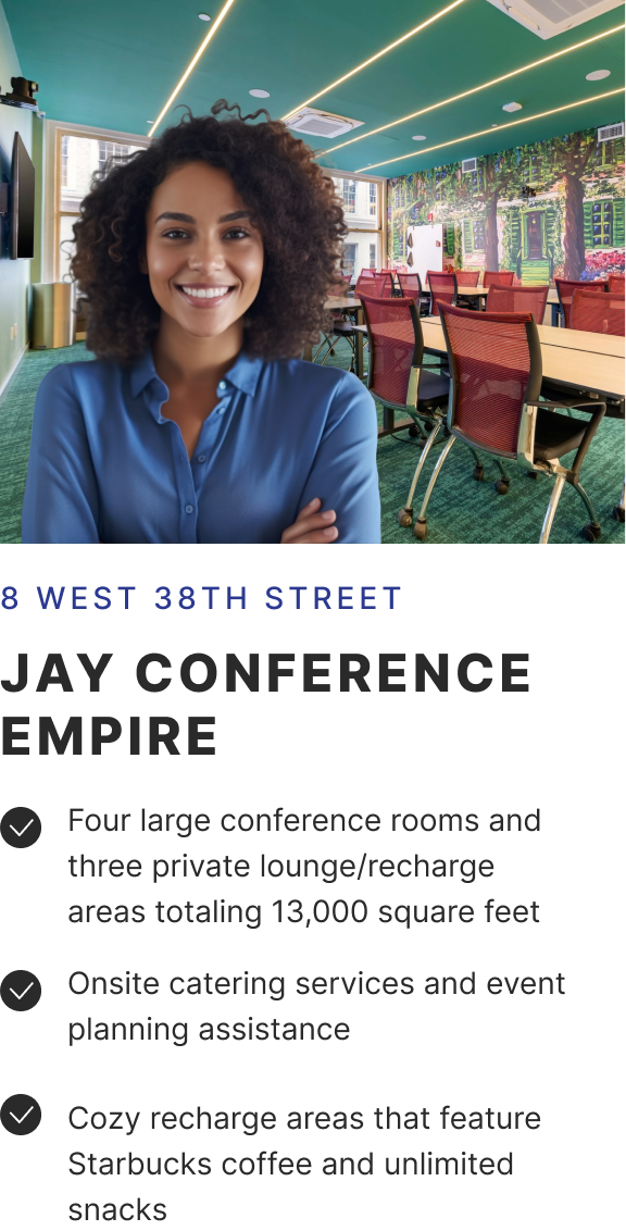 We rented a corporate meeting space at the Jay Suites in the Financial District and we were very impressed by the accommodations. In addition, the ease of booking their conference room booking process online made it a breeze. We would definitely book their New York City meeting spaces again.