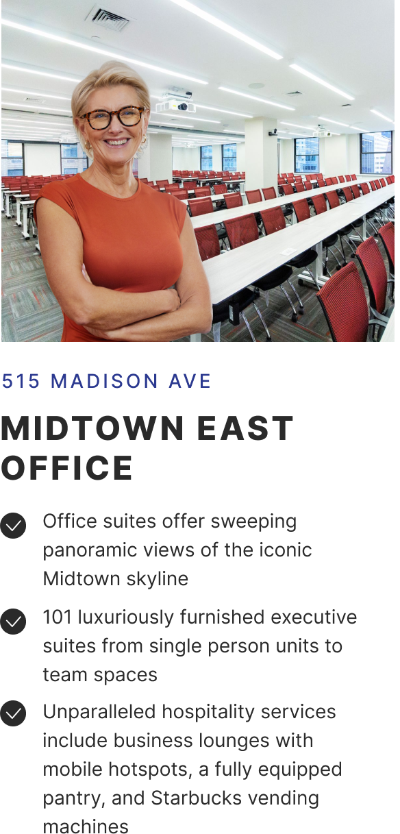This office space has everything we look for in our business. The NYC conference rooms for rent are fully equipped and convenient for meeting with clients or visiting co-workers. Although I have the option to work from home, I find myself coming into the office every day to take advantage of all it has to offer…